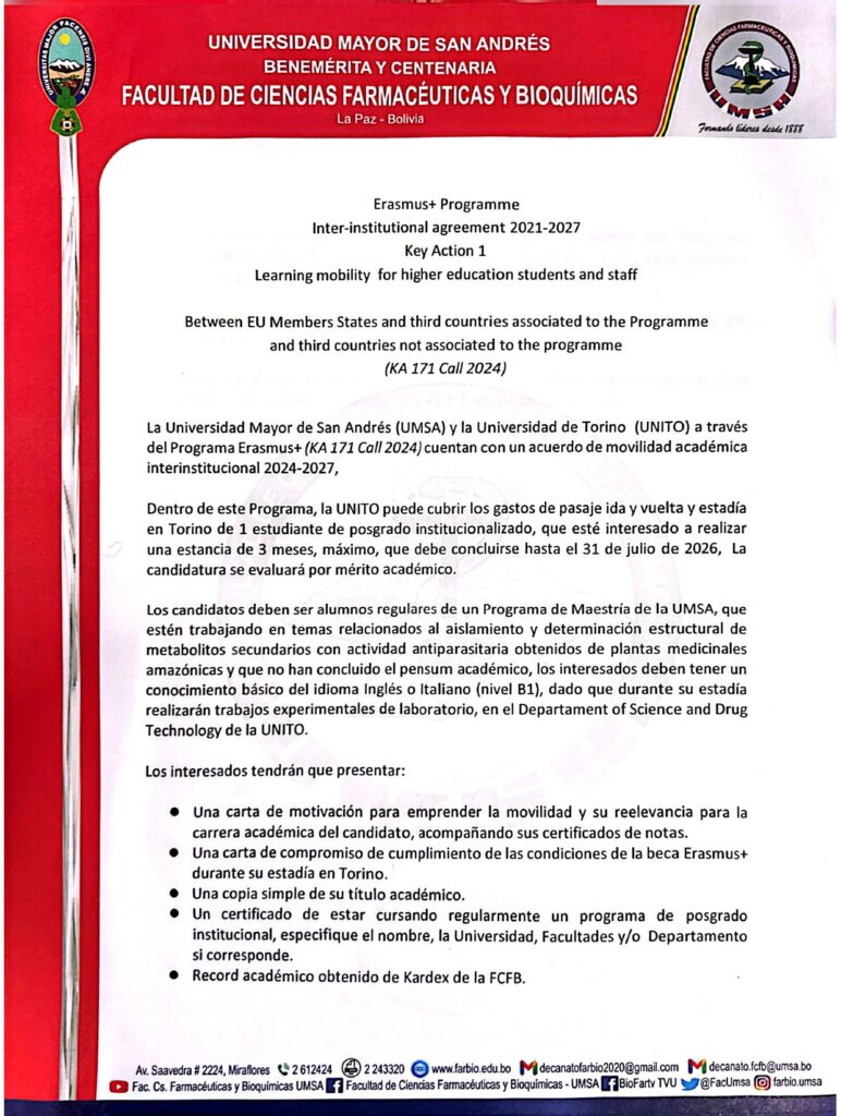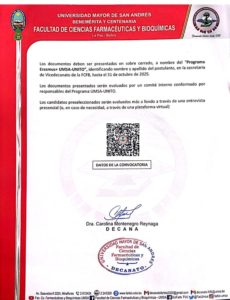CONVOCATORIA BECA ERASMUS+ OCTUBRE 2025 DATOS DE LA CONVOCATORIA DESCARGAR UNIDADES DE SERVICIO UNIGENUnidad de Identificación Genética FARMACIA INSTITUCIONAL BIOTERIO FACULTATIVOUnidad de Ensayos Biológicos - Bioterio (UEB-B) Puedes bajar el documento Aqui . . . Sistema Académico Plataforma Virtual Biblioteca Gaceta Facultativa Prueba de Suficiencia Académica UNIDADES ADMINISTRATIVAS CSEGCCentro de Seguimiento y Gestión de la Calidad Unidad de Administración Desconcentrada Registro y Archivo NÚMERO DE ALUMNOS MATRICULADOS. GESTIÓN 2023 CARRERA QUÍMICA FARMACÉUTICA ESTUDIANTES 0 CARRERA BIOQUÍMICA ESTUDIANTES 0 Visítanos en Facebook Youtube Twitter Telegram Instagram