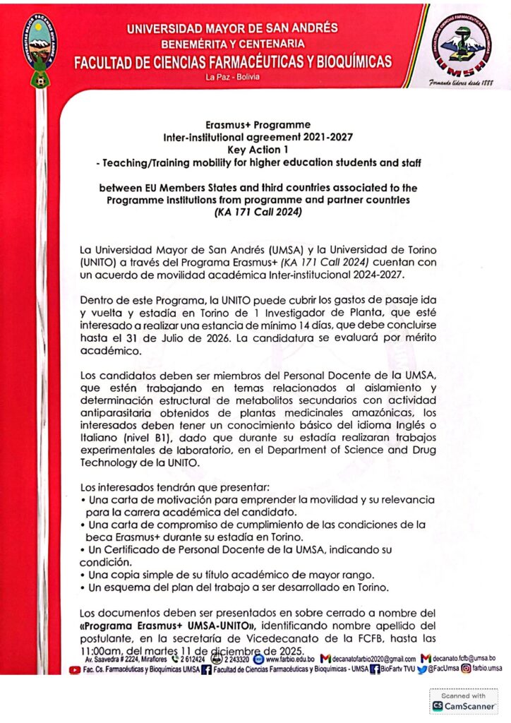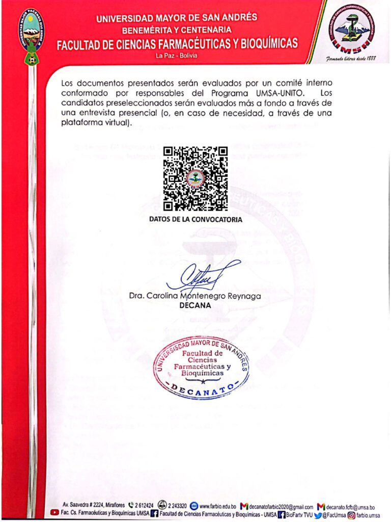 CONVOCATORIA BECA ERASMUS+ NOVIEMBRE 2025 DATOS DE LA CONVOCATORIA DESCARGAR UNIDADES DE SERVICIO UNIGEUnidad de Identificación Genética FARMACIA INSTITUCIONAL BIOTERIO FACULTATIVOUnidad de Ensayos Biológicos - Bioterio (UEB-B) Puedes bajar el documento Aqui . . . Sistema Académico Plataforma Virtual Biblioteca Gaceta Facultativa Prueba de Suficiencia Académica UNIDADES ADMINISTRATIVAS CSEGCCentro de Seguimiento y Gestión de la Calidad Unidad de Administración Desconcentrada Registro y Archivo NÚMERO DE ALUMNOS MATRICULADOS. GESTIÓN 2023 CARRERA QUÍMICA FARMACÉUTICA ESTUDIANTES 0 CARRERA BIOQUÍMICA ESTUDIANTES 0 Visítanos en Facebook Youtube Twitter Telegram Instagram