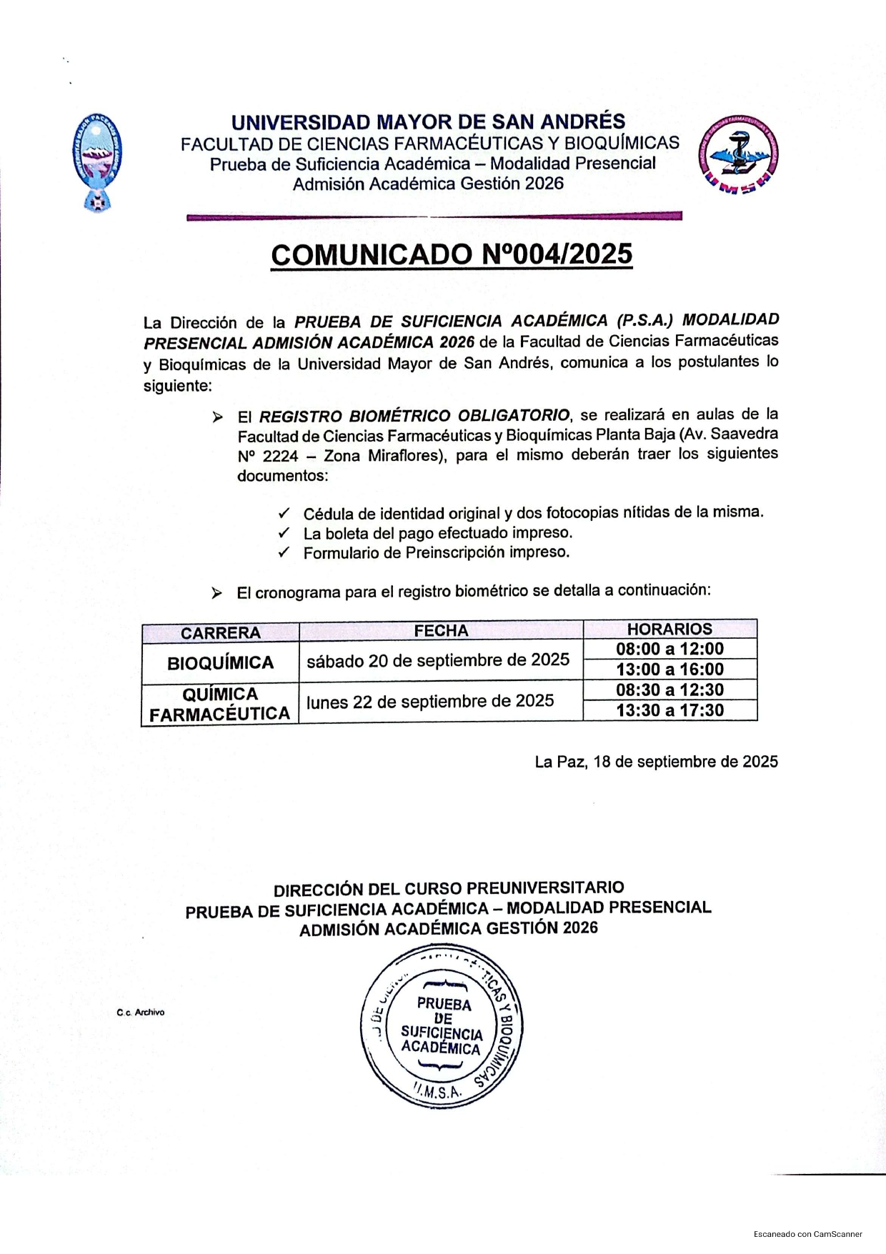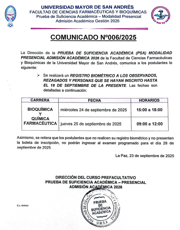 Los inscritos deberán realizar su REGISTRO BIOMÉTRICO OBLIGATORIO en predios de la Facultad. Se comunicará el cronograma de registro oportunamente